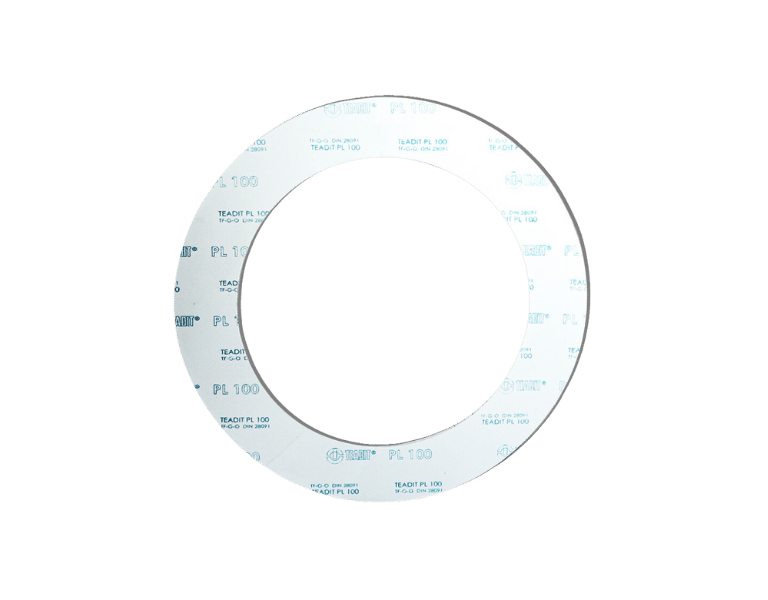 TEADIT® PL 100 é uma placa de elevada compressibilidade, fabricada com PTFE, através de um processo único de laminação, com um alto nível de fibrilação, o que proporciona reduzida perda de aperto e escoamento, deficiências inerentes às placas usinadas (Skived) existentes no mercado. Devido às propriedades químicas do PTFE, TEADIT® PL 100 é indicado para a vedação de uma grande variedade de fluidos quimicamente agressivos, sendo também utilizado em contato com alimentos e produtos farmacêuticos. Apresenta excelente estabilidade dimensional, retenção de torque e a melhor relação custo benefício entre materiais similares. Através do processo de fabricação do TEADIT® PL 100 se obtém uma placa rígida e com baixa densidade, que facilita a confecção de juntas leves e estruturadas, permitindo sua instalação até em locais de difícil acesso e com pouco espaço para a abertura dos flanges. Sua alta compressibilidade possibilita, também, que as juntas fabricadas com TEADIT® PL 100 possam ser utilizadas em flanges ou superfícies irregulares. Suas propriedades anti-aderentes facilitam a retirada das juntas após o uso, inclusive, sem que restem resíduos de material nos flanges.